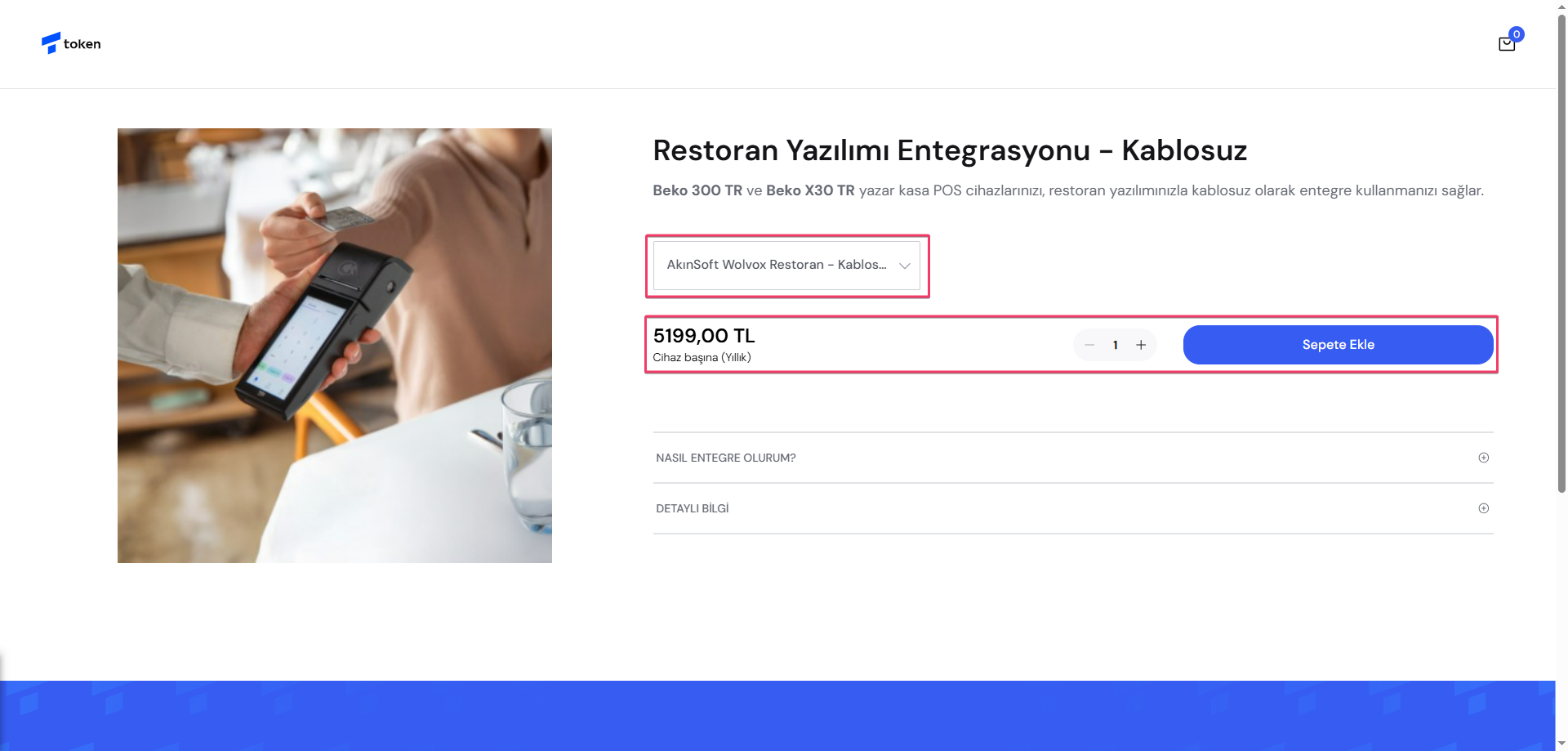 Cihaz temin etme işlemi gerçekleştikten sonra cihaz montaj işlemi denilen malileştirme, EKU ve banka tanımlarının yapılması gerekmektedir. Bu işlemler tamamlanmadıysa cihaz tedarikçinizle görüşüp servis yönlendirmesi sağlamasını istemelisiniz. Tüm tanımlamalar yapıldığında https://appstore.tokeninc.com/urunler/restoran_kablosuz_entegrasyon adresinden entegrasyon paketini AKINSOFT Wolvox Restoran Kablosuz seçeneğini seçerek sepetinize ekleyiniz. İlgili hizmeti cihaz başına yıllık alıyor olacaksınız.